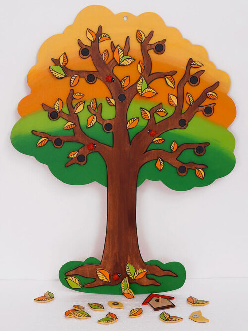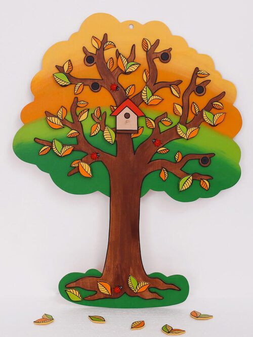 ze stromů lze sundávat a přendávat na různá místa kytky,ptáčky,krmítka,lístky,sníh…..